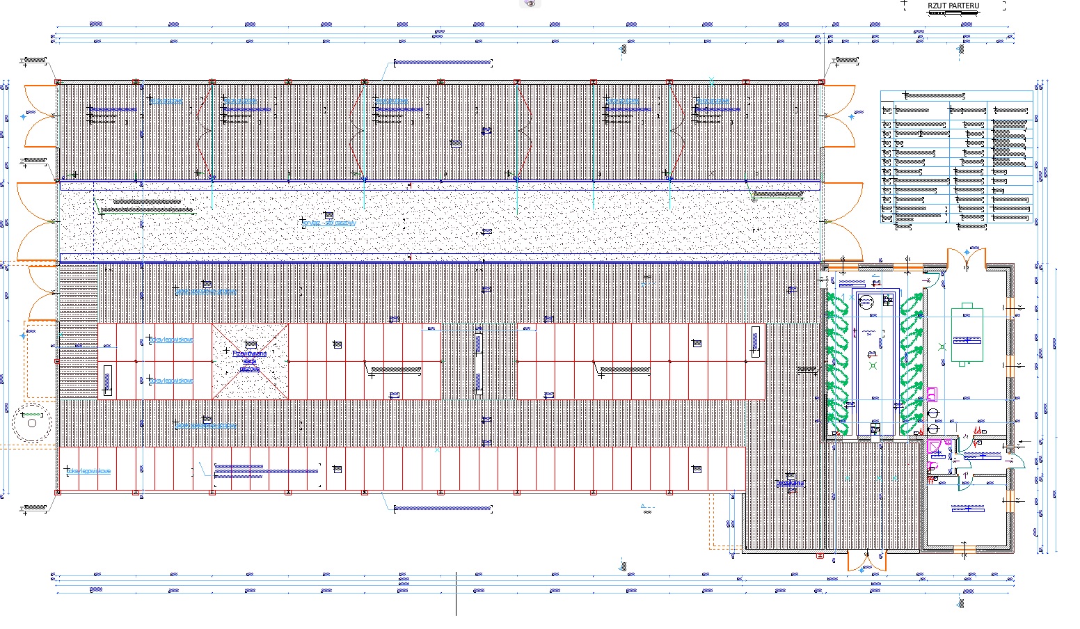 Część niższa budynku – tzw. technologiczna (tj. hala udojowa, zlewnia mleka, biuro z zapleczem sanitarnym) – jako typu „ciepłego”, ściany 3-warstwowe, posadzka izolowana, pokrycie dachowe z płyty warstwowej.