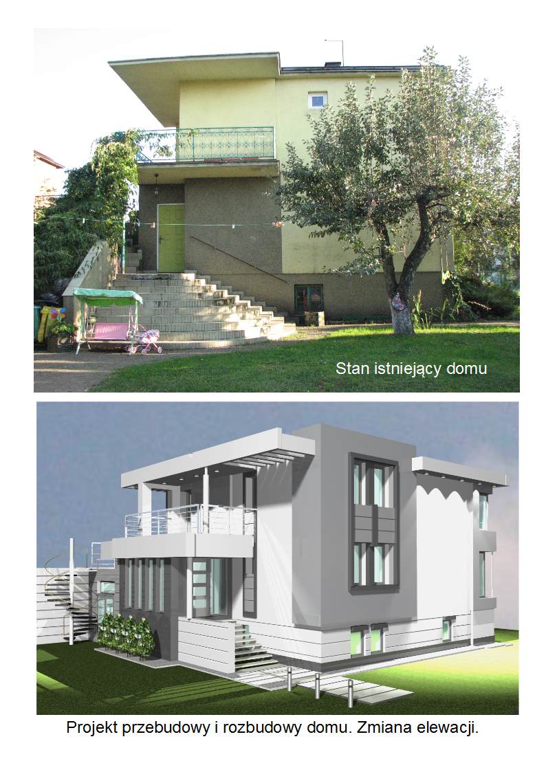 Rozbudowa budynku: wykonanie ganka. Dach bez zmian, zaprojektowano wokół budynku daszki żelbetowe pełne albo ażurowe wystające poza obrys ścian zewnętrznych.