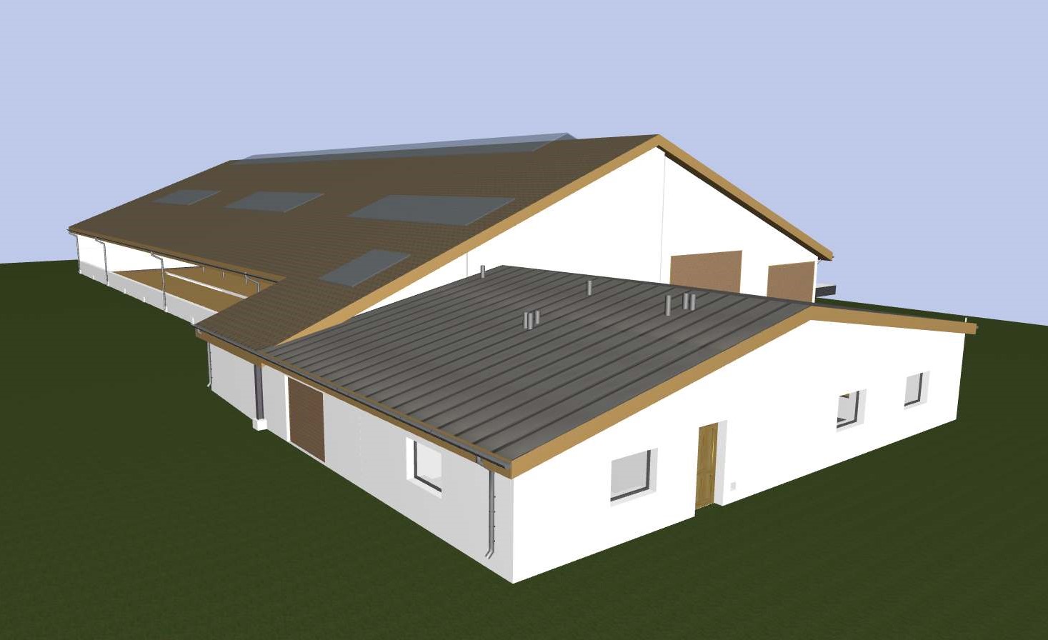 Część niższa budynku – tzw. technologiczna (tj. hala udojowa, zlewnia mleka, biuro z zapleczem sanitarnym) – jako typu „ciepłego”, ściany 3-warstwowe, posadzka izolowana, pokrycie dachowe z płyty warstwowej.