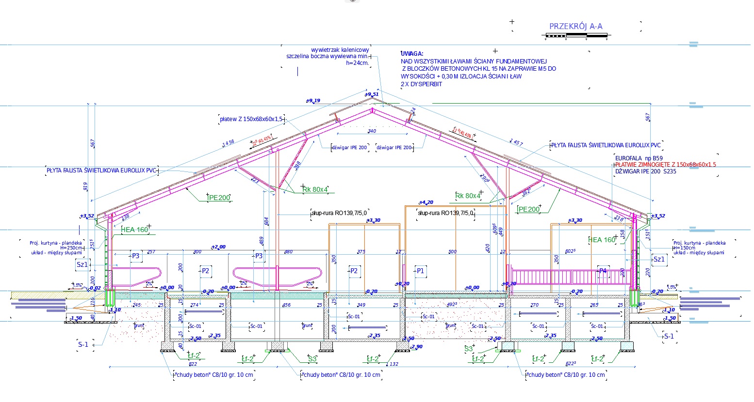 Budynek w części wyższej – obora – konstrukcja nośna – stalowa. Dach z pokryciem z Eurofali. Ściany zewnętrzne boczne częściowo murowane, częściowo z płyt warstwowych. Ściany boczne częściowo jako murowane - przysłonienie boksów/kojcy, a częściowo w formie kurtyn z plandeki materiałowej.